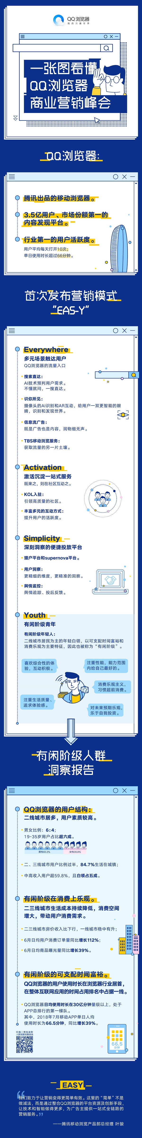 9月5日,騰訊移動瀏覽器產品部總經理葉俊在2018首屆QQ瀏覽器商業營銷峰會表明:“咱們努力于讓營銷變得更簡略有用。這兒的‘簡略’不失做減法,而是經過整合QQ瀏覽器的渠道資源及立異手段,讓技能和智能做得更多,為廣告主供給一站式全鏈路的營銷服務。” 在技能老練越發迅猛的今日,營銷行業都想捉住時機,以最快的速度學習并應用到實踐中。面臨用戶對營銷信息的敏感度越來越高和營銷模式的同質化削弱品牌營銷的功率的環境下,讓用戶獲取信息更風趣,以及讓企業信息更有用的傳達就顯得尤為重要。那么,努力讓“營銷變得更為簡略”的QQ瀏覽器又是怎樣做到的呢?下面,一張圖帶你看懂QQ瀏覽器“EASY”模式下的簡略營銷。